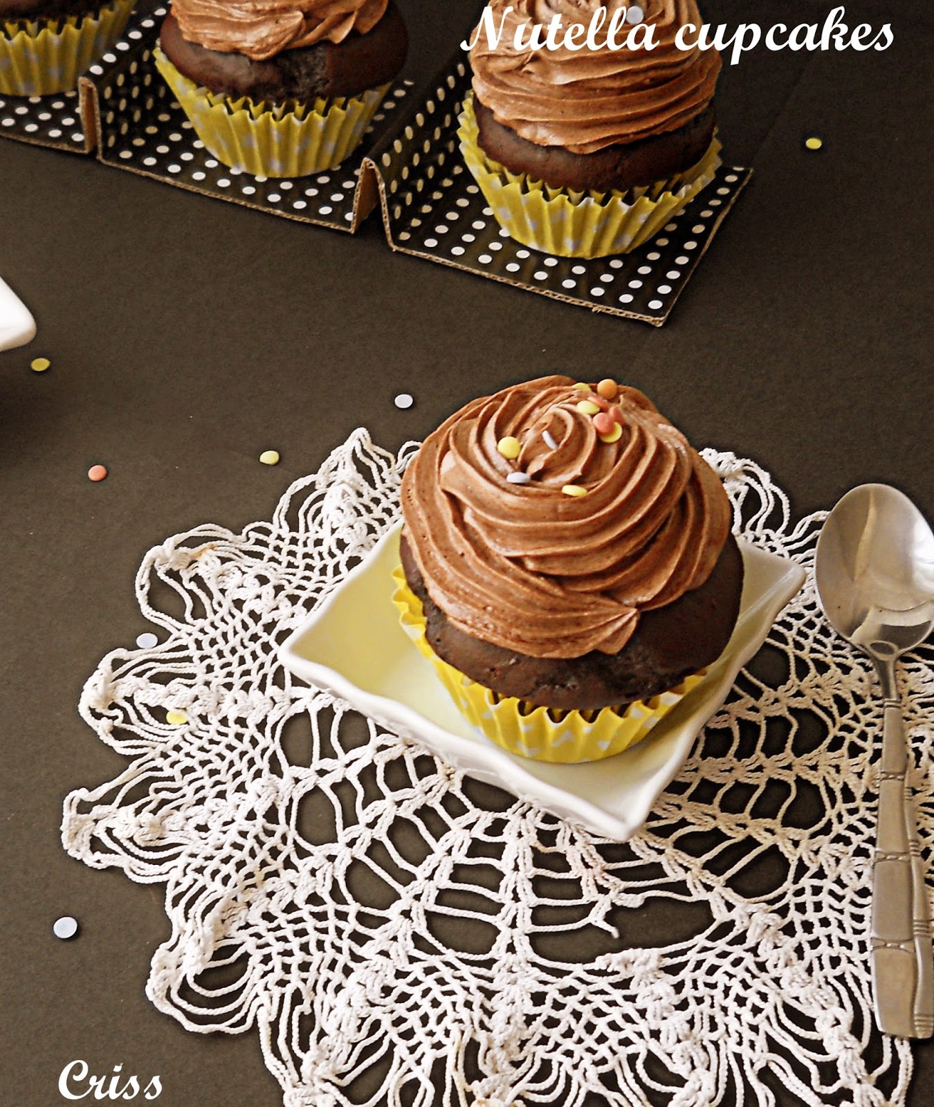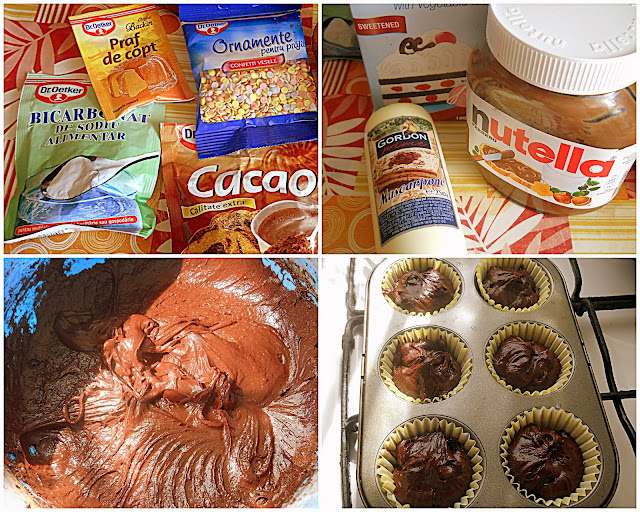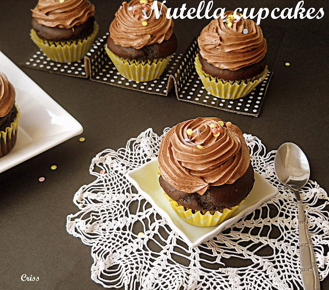 Cupcakesurile, aceste prajiturele dragalase si foarte populare, ii plac mult lui Alex. Mie imi place mai mult sa le fac, sa le decorez, dar sincer nu ma dau in vant dupa ele. Insa dupa parerea mea sunt niste prajituri usor de facut si destul de rapide, astfel ca ieri cand Alex mi-a zis ca ar manca ceva dulce cu nutella, am pus pitica la culcare si in aproximativ 10 minute, aveam 10 cupcakes la cuptor. (Ieseau si 12 bucati, dar n-am estimat eu bine cantitatea de compozitie pusa in cosulete la copt si dupa cum se vede, au crescut mult de tot.) Reteta de cupcake puteti sa o folositi si ca blat de tort, daca va doriti un blat umed, cu gust intens de cacao. Imi pare rau ca n-am taiat o prajitura sa vedeti cum arata in sectiune.