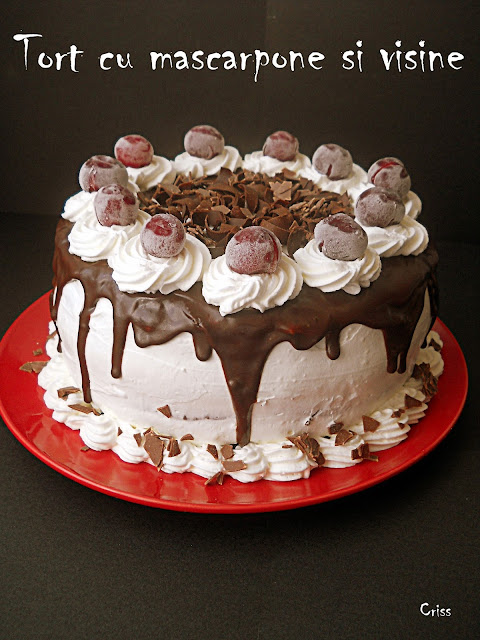 (Eu am asamblat tortul in cratita in care am copt blatul. In cratita se pune folie alimentara usor umezita, se aseaza primul blat, se insiropeaza, se adauga jumatate din crema, cateva visine, apoi al doilea blat insiropat, restul de crema, visine si al treilea blat insiropat. Se acopera tortul cu folie alimentara si se pune in frigider minim 2 ore. Dupa doua ore, se rastoarna pe un platou si se decoreaza. 100 ml frisca se bat spuma si se amesteca cu cele 3 linguri de crema. Se acopera tortul cu crema. Ciocolata se topeste impreuna cu frisca lichida si se toarna pe marginea tortului, lasand sa se prelinga. Pe mijloc se pun fulgi de ciocolata si de jur imprejur se fac rozete din frisca. Pe fiecare rozeta se pune cate o visina. Se mai tine tortul in frigider 2 ore, apoi se poate taia. Simplu si delicios. Ai mei m-au criticat ca am facut un tort prea mic, asa ca se cere repetat. :)