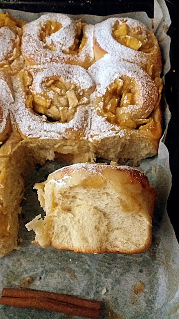 Aluatul se intinde intr-o foaie dreptunghiulara, se pun merele, se ruleaza si se taie in 12 bucati egale. Melcisorii se pun in tava pe hartie de copt si se mai lasa 20 minute sa creasca. Se coc apoi in cuptorul preincalzit, aproximativ 30-35 minute, apoi se scot si se pudreaza cu zahar.