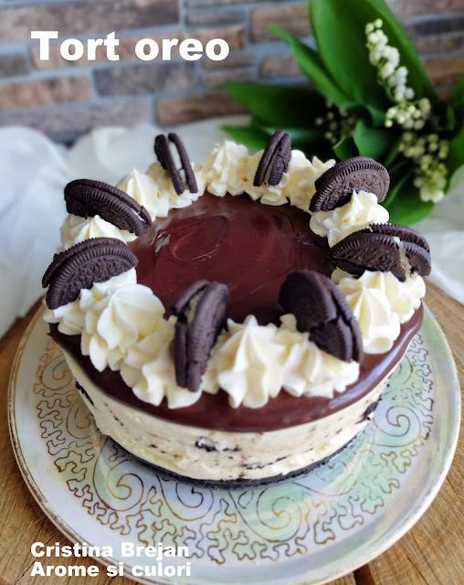 Am copt prajitura 30 minute la 180C, apoi am lasat-o sa se raceasca si am turnat deasupra glazura obtinuta din 200 g ciocolata topita si 100 ml smantana pentru frisca.