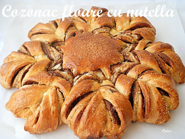 EDIT 01.01.2017 Asa cum v-am promis, am refacut cozonacul floare si de aceasta data pozele finale sunt mai frumoase. Cred ca se observa diferenta. In plus, fata de cel de saptamana trecuta, pe a doua foaie nu am mai pus nutella ci o crema de nuca (1 albus de ou, 50 g zahar pudra, 80 g nuca macinata, o lingurita esenta de rom). Dupa parerea mea e mult mai buna aceasta varianta decat prima.