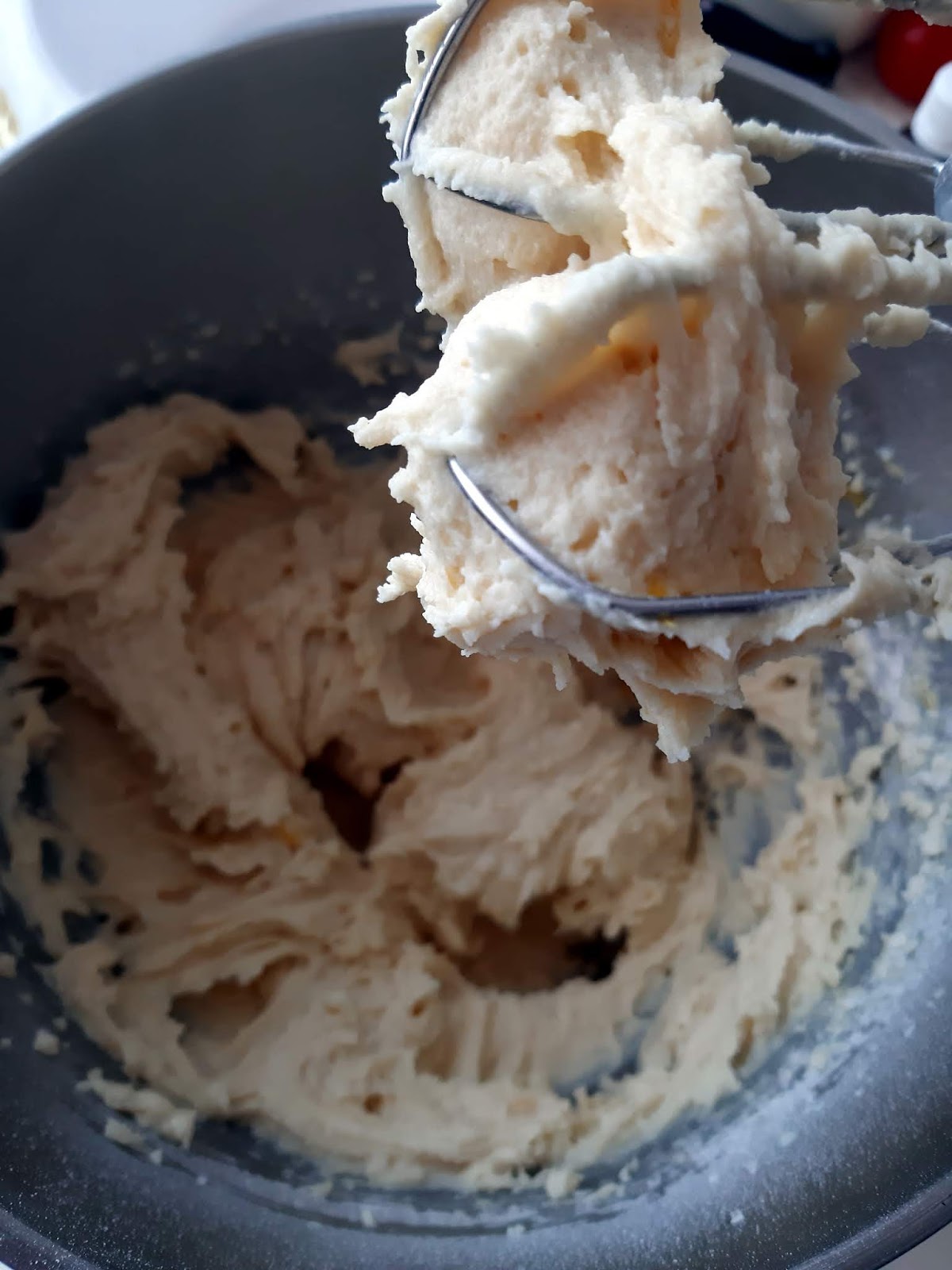Ouale se bat cu zaharul, sarea si zaharul vanilat, pana cand isi dubleaza volumul si se albesc. Se adauga branza de vaci, coaja rasa de lamaie sila final faina amestecata cu praful de copt. Compozitia va fi destul de vartoasa, dupa cum se vede in poza, nu cade de pe paletele mixerului.